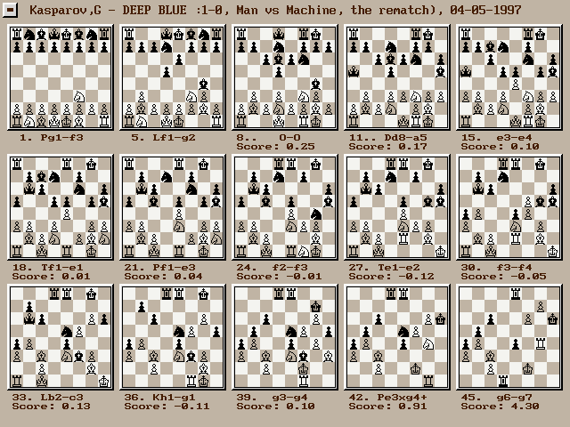DEEP BLUE :10.00 0.02 g7-g5 Nh4-f3 g5-g4 h3xg4 Nf6xg4 b3-b4