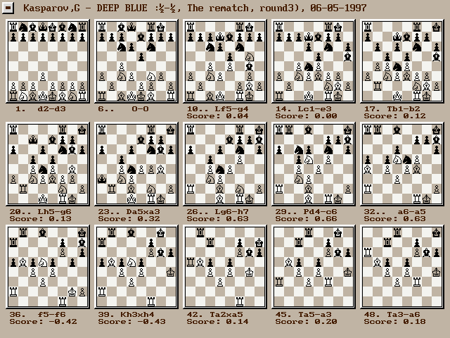 DEEP BLUE :12.00 0.48 d6xe5 Rf1-f3 f7-f6 Rf3-f1 Kh8-g7 Rf1-b1