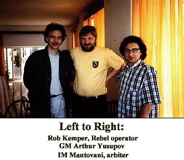 From June 2 till June 5,1997 Rebel in Italy on the island Ischia will play 18 games against TOP12 player Arthur Yusupov June2 10 blitz games (5 minutes) June3 5 semi blitz games (15 minutes) June4 2 active chess games (30 minutes) June5 1 one hour game Used hardware by Rebel Final standing of the match REBEL-Yusupov 10½ - 6½ After the match Yusupov said the following about his computer opponent: We the Schröder BV want to thank Arthur Yusupov for his kind words about Rebel. Moreover a rematch for next year was suggested by our Italian sponsor and both Arthur Yusupov and the Schröder BV accepted the offer!