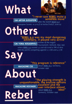 "I never saw REBEL make a senseless move"GM ARTUR JUSSUPOW after the match Rebel 9.0 - Jussupow (score 10½-6½) at Ischia (Italy), June 1997 "REBEL 9.0 was my most dangerous adversary, it played very active" GM YONA KOSASHVILI winner of the Aegon Tournament, Holland, May 1997 "This program is reference" MAGAZINE CSS about Rebel 8.0, Germany, October 1996 "The playing strength is unquestionable, the analyse options excellent and the user interface almost ideal" MAGAZINE ROCHADE about Rebel 8.0, Germany, October 1996 Complete picture |